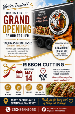 Join us at the ribbon cutting ceremony for Taquizas Morelenses! This is to celebrate the grand opening of its food truck. Enjoy authentic Mexican food while hearing more about the owner's story and take advantage of the event-only offers as well.